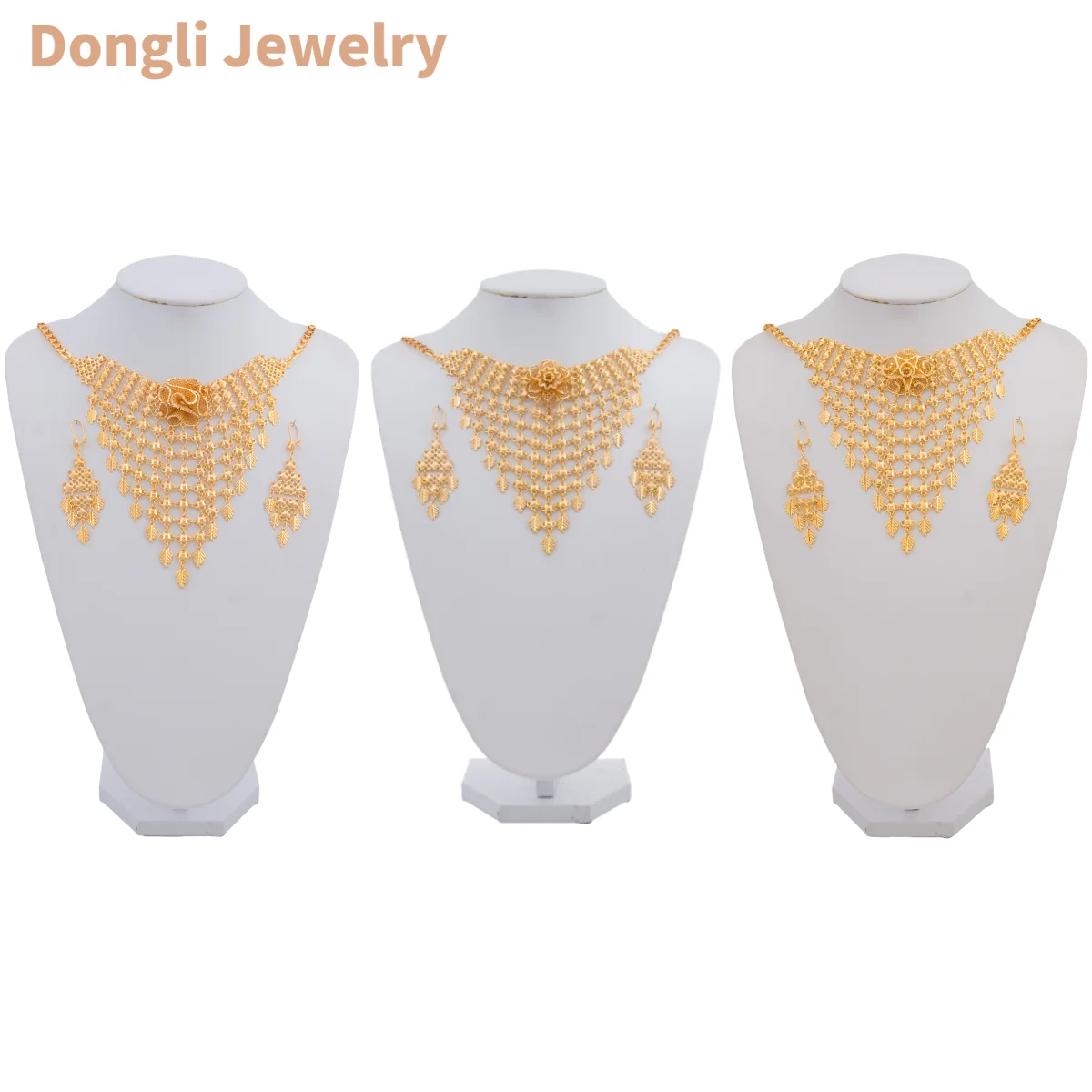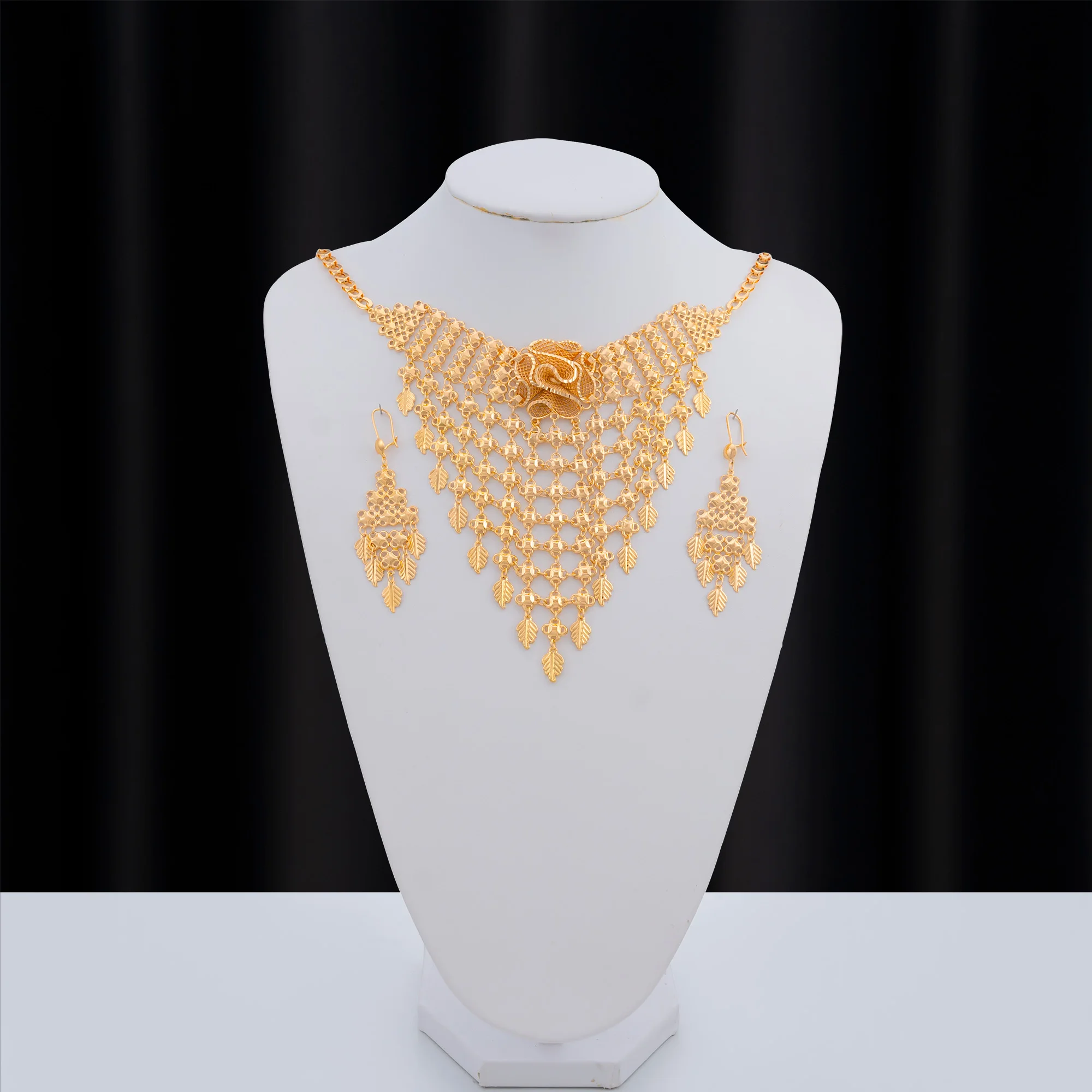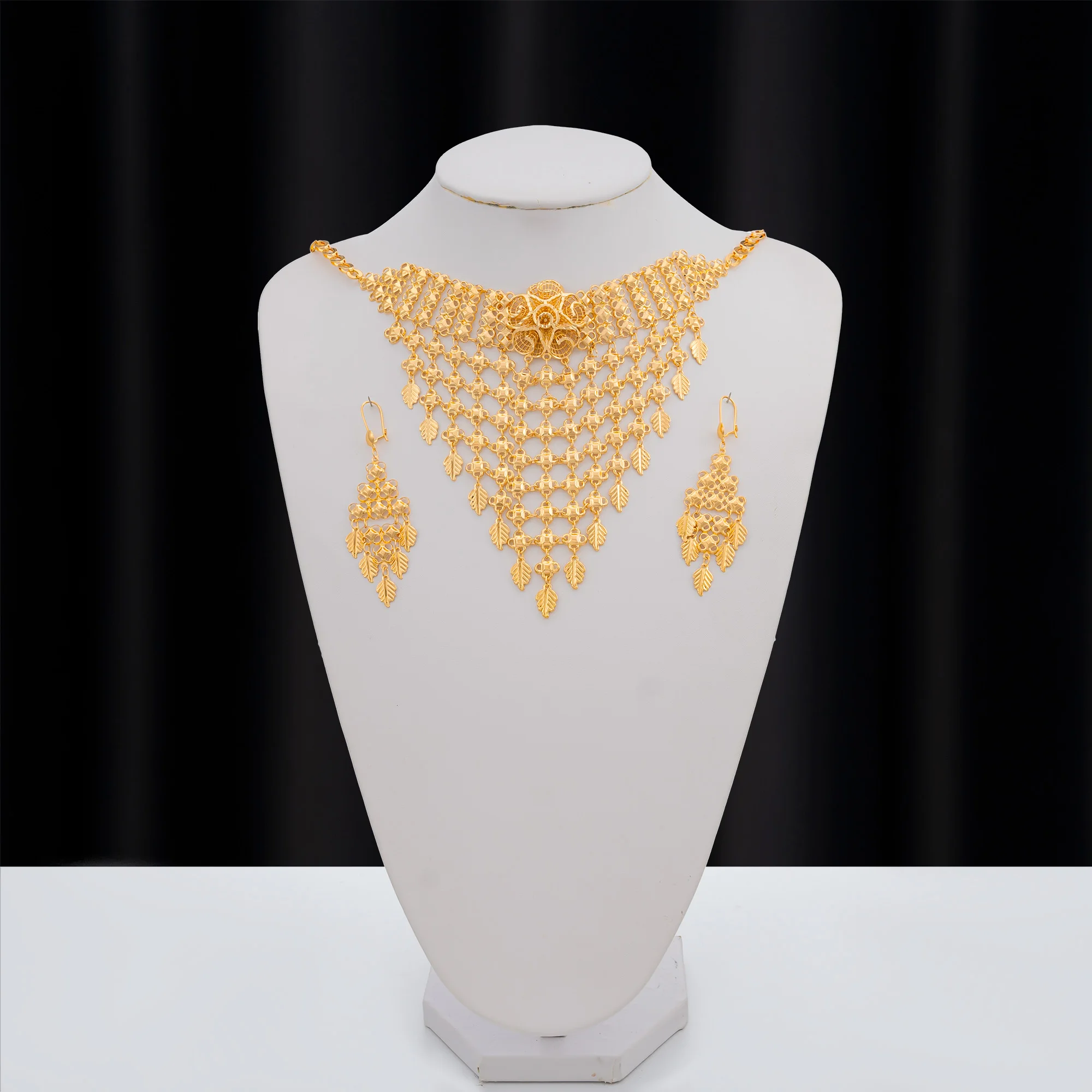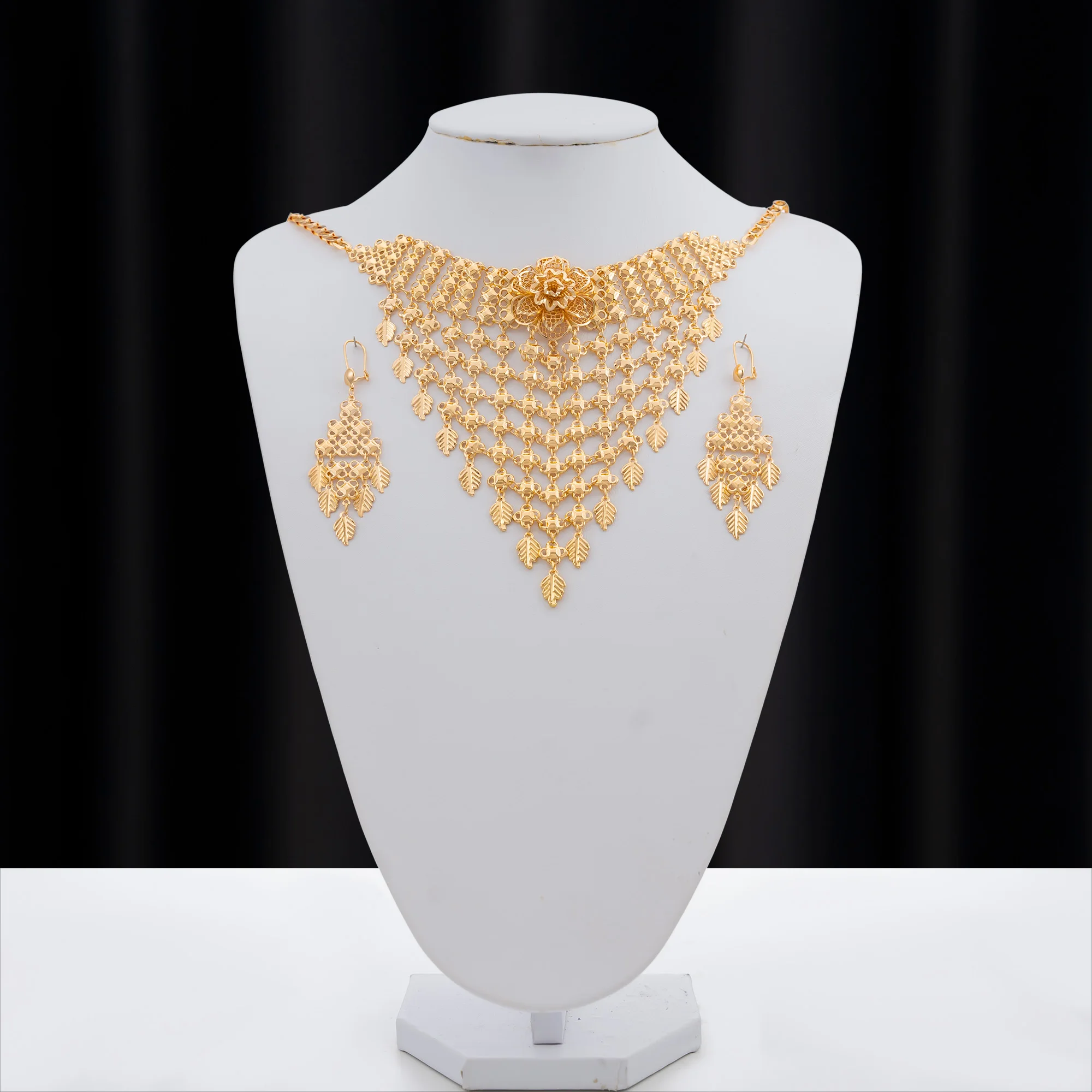 Dongli Jewelry Exquisite Champagne Gold Brass 2-Piece Set with Arabic Floral Mesh & Leaf Pendants for Festive Banquets